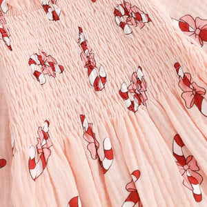 Festive candycane and bow lightweight long sleeve romper with ruched bodice.