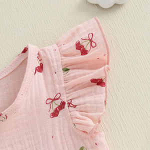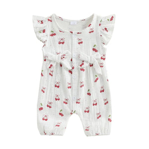 Short sleeve cherry print jumpsuit with bow & flutter features.
