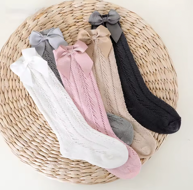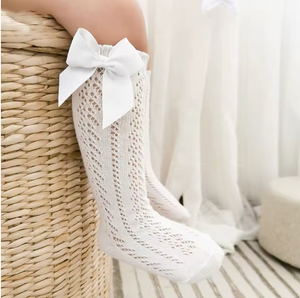 Pretty knee high socks with bow.Features: Material: Cotton Blend Assorted Colours Care: We recommend a gentle washDo not tumble dry Do not bleach